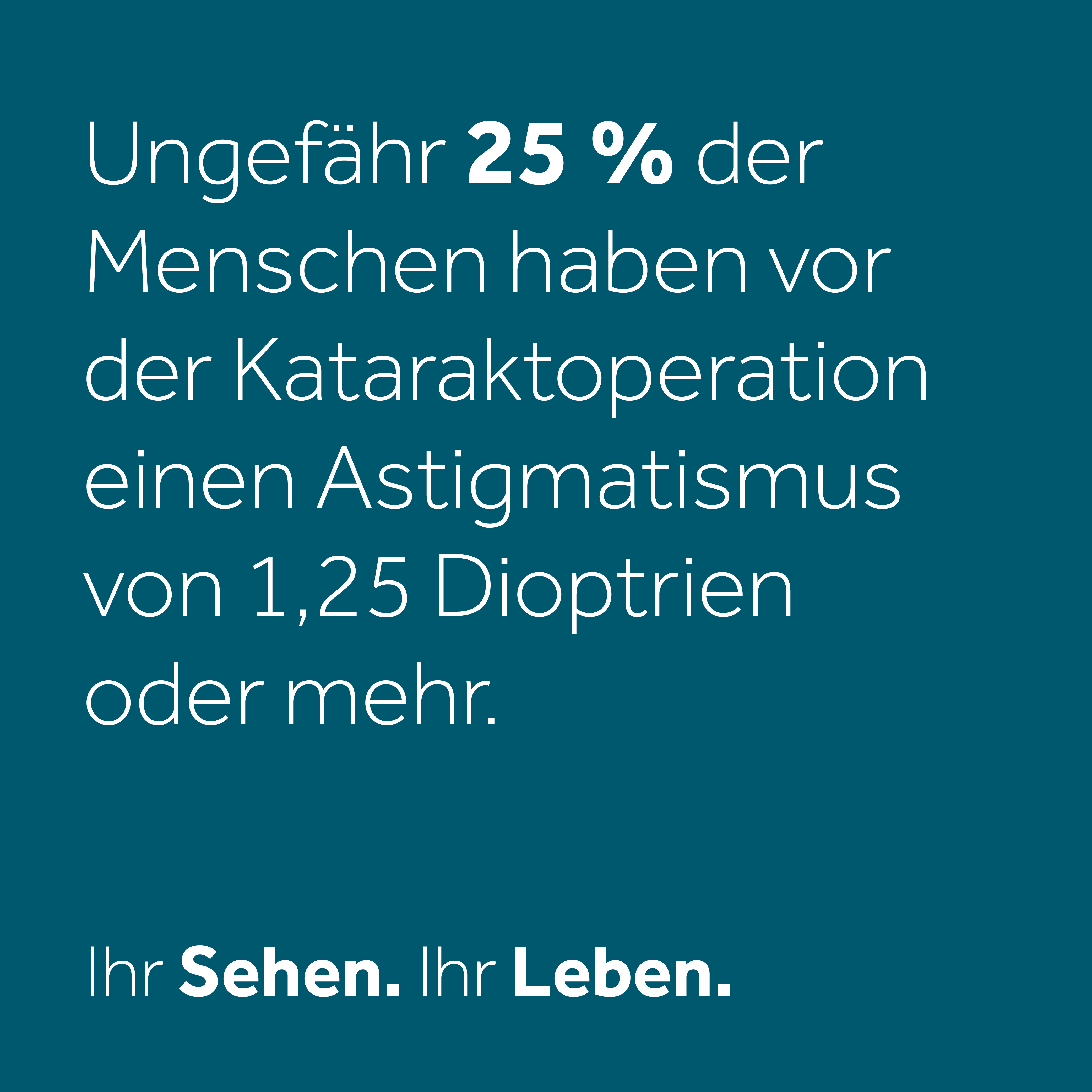 In Kombination mit einer Operation des Grauen Stars oder zur Korrektur der Presbyopie (Altersweitsichtigkeit) stellt eine torische Intraokularlinse (IOL) eine zuverlässig wirksame Methode zur Verringerung eines bestehenden Astigmatismus dar.3