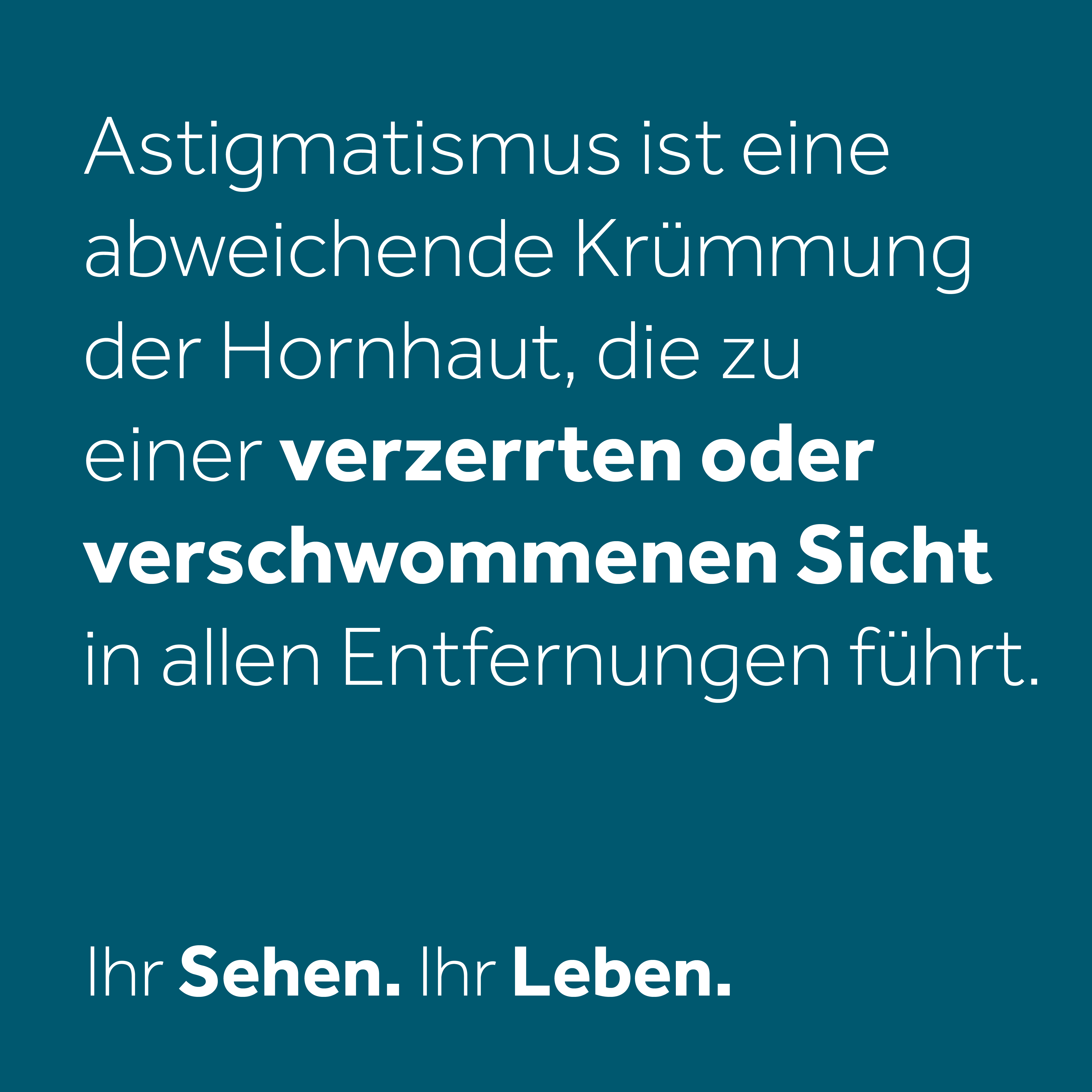 Wenn die Hornhautkrümmung unregelmäßig ist, wird das in das Auge einfallende Licht nicht richtig von der Netzhaut aufgenommen, was zu einer unscharfen und verzerrten Sicht führt, unabhängig von der Entfernung, in der sich die Objekte befinden2.